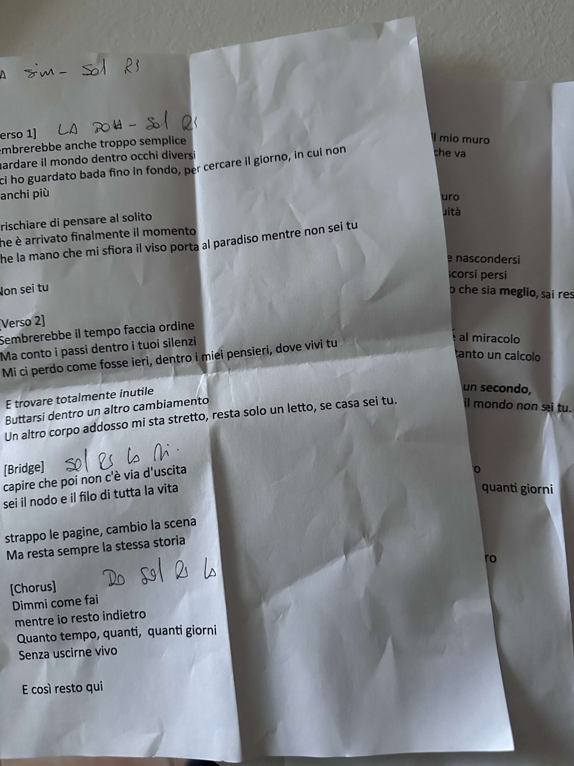 Questa tensione armonica esplode nel chorus, dove rompo la discorsività delle strofe per passare a frasi brevi e urgenti: “Dimmi come fai / mentre io resto indietro”.